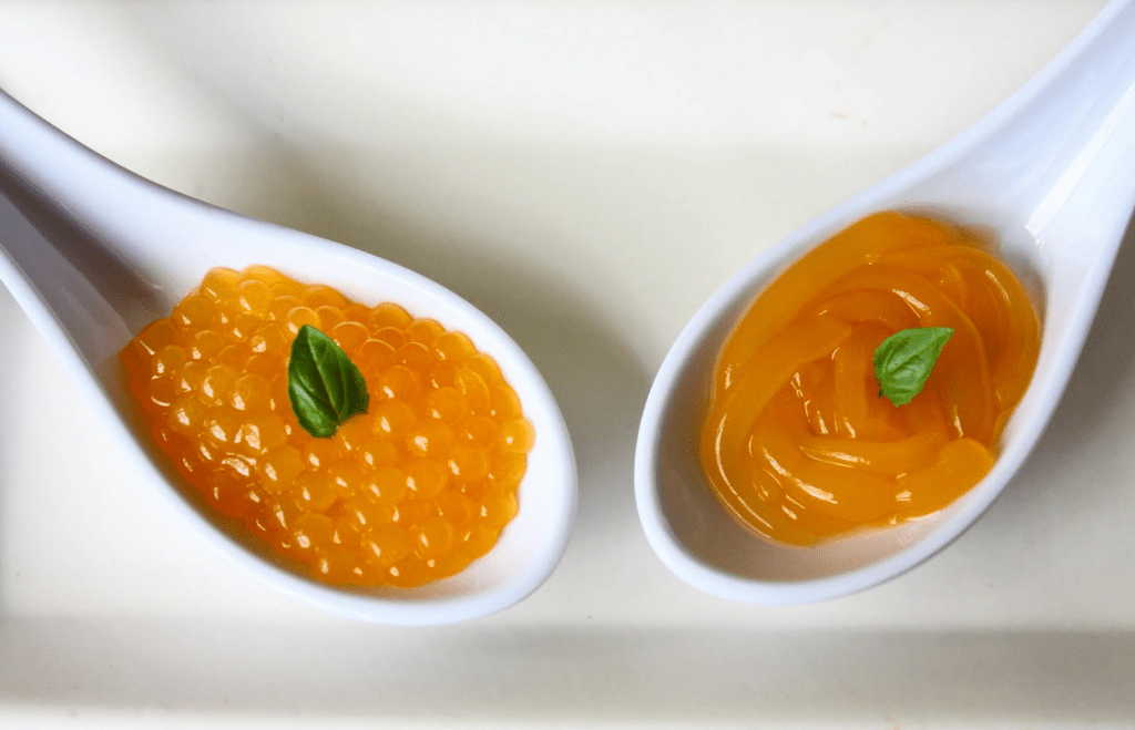 - Kapsullaşdırma (sferifikasiya): Qidanın tərkibinə kimyəvi maddələr əlavə edilməklə qida məhsulları aşağıdakı şəkildə gördüyünüz formada kapsul, sanki balıq kürüsünə oxşar formaya gətirilir. Çox incə olduğundan qidaya istədiyiniz formanı verə bilərsiniz.